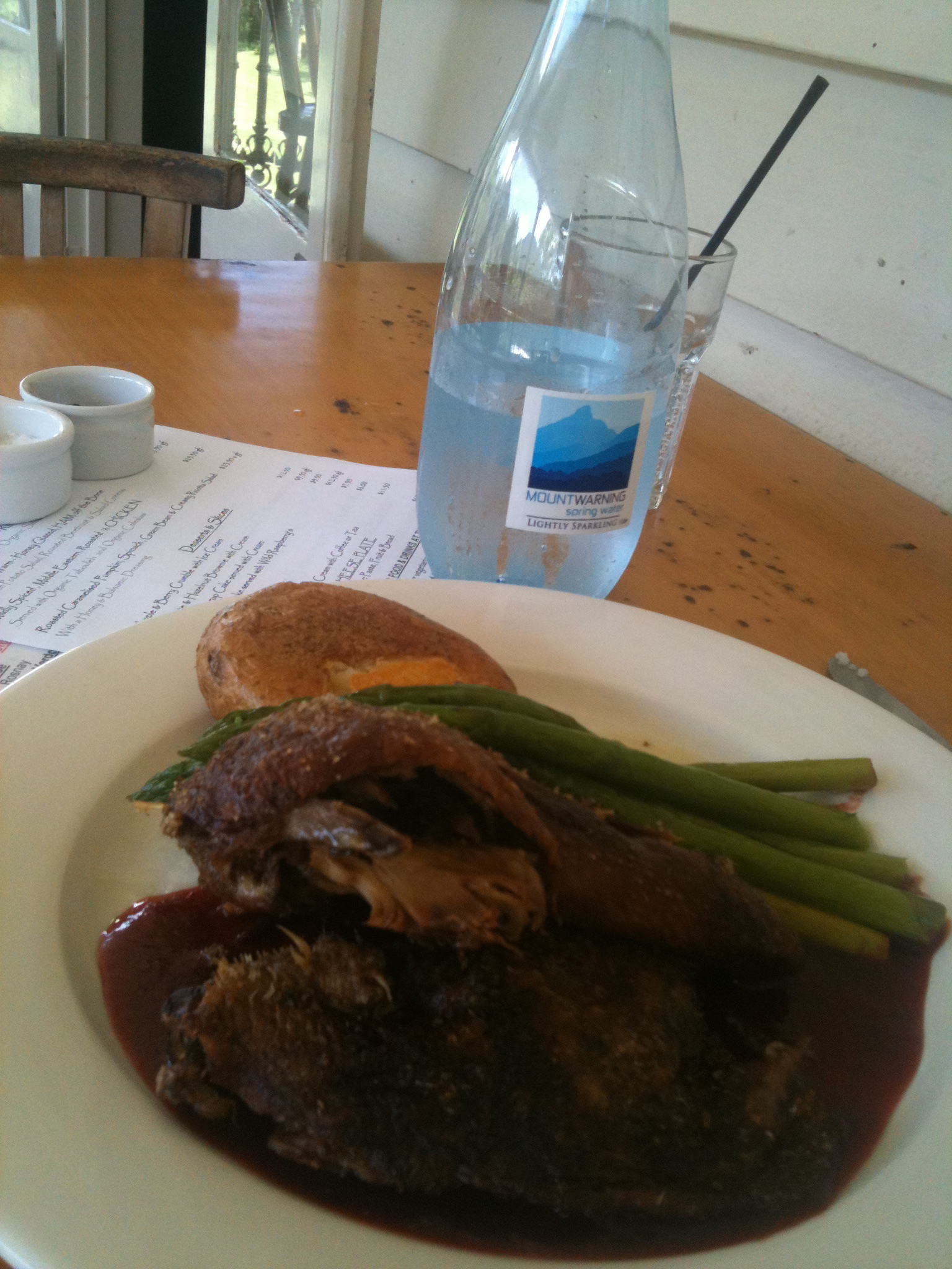 - I had lunch at Eltham Valley Pantry. It was me and a dozen or so people all over 75. I loved it. Sitting on the verandah of an old Queenslander overlooking a pecan farm eating a ploughmans lunch of local produce and a pecan pie that’s worth crossing rivers for. The recipe, by the way, is here. I loved that they don’t use serviettes, instead a wet facecloth is placed on the table (just like we had at home!) and they don’t use anything disposable. They also don’t play music. I like this. The quiet is good.