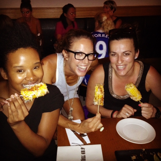 Here we three are in Melbourne last night. We had dinner together at Mamasita. We were this (—–) excited about these corn cobs (which everyone in town just has to tell you to try). FYI: everything – I REPEAT EVERYTHING – on the menu is 100% gluten free!