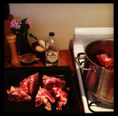 Meanwhile, place the meaty bones in a roasting pan and brown at 180C or 350F in the oven. When well browned, add to the pot along with the vegetables.
