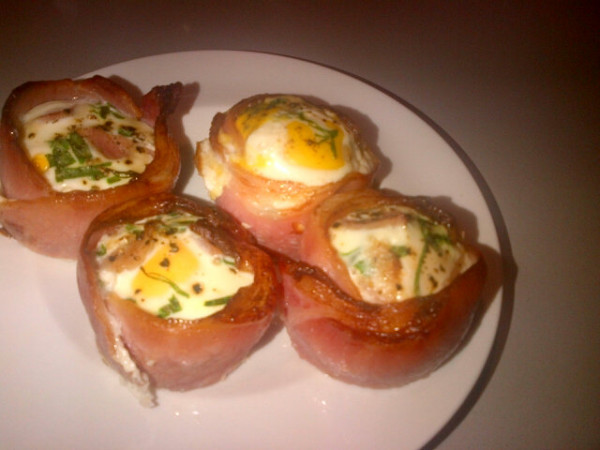 Alan doesn’t provide a recipe, but I’ve made these before – line muffin tins with bacon or ham, crack an egg in and bake in 200C oven for about 10-12 minutes… sprinkle with feta or chives.