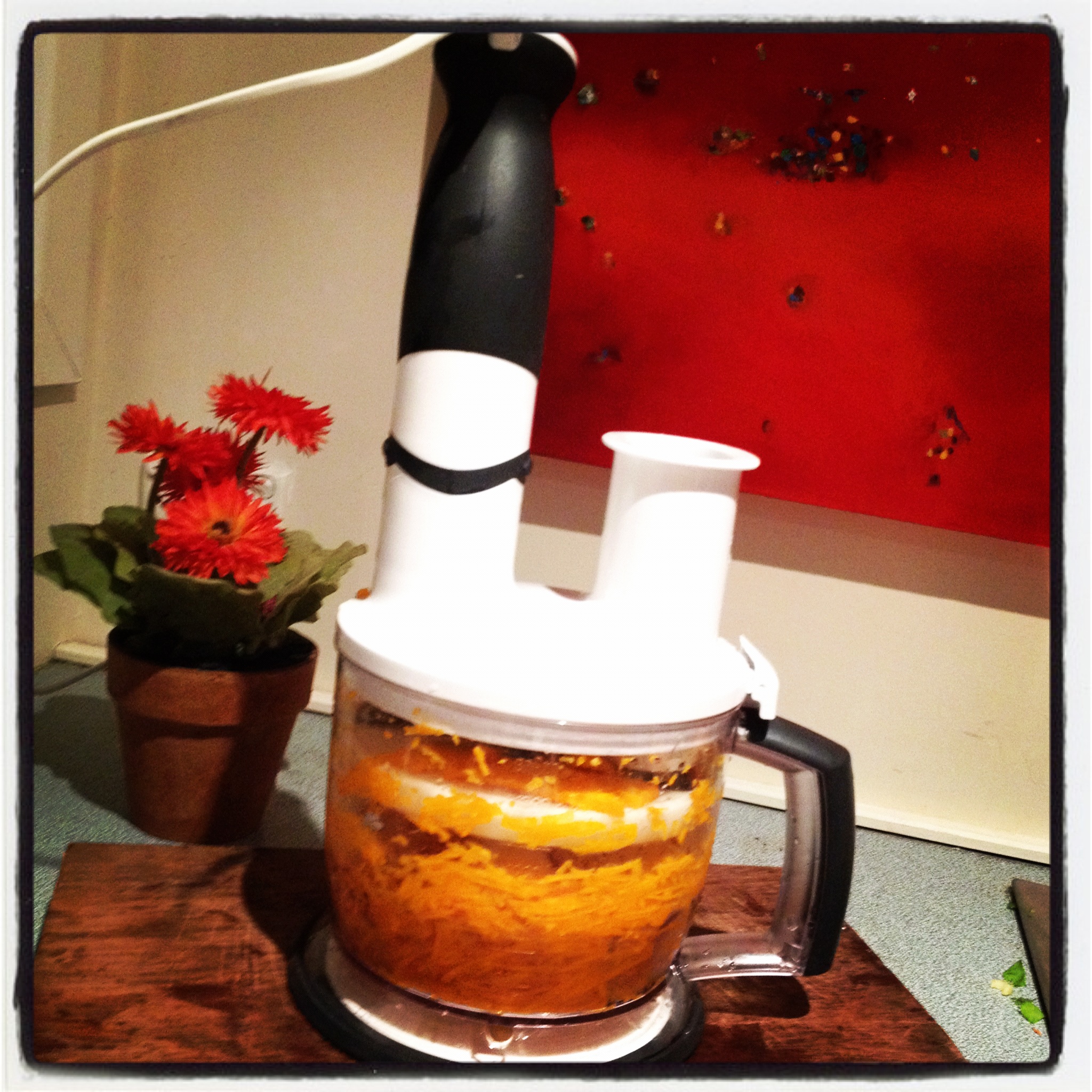 [I grated the pumpkin in a blender, then used the container as the bowl…saving washing up and complications. And PS, apologies for the shocking images…not my forte.]