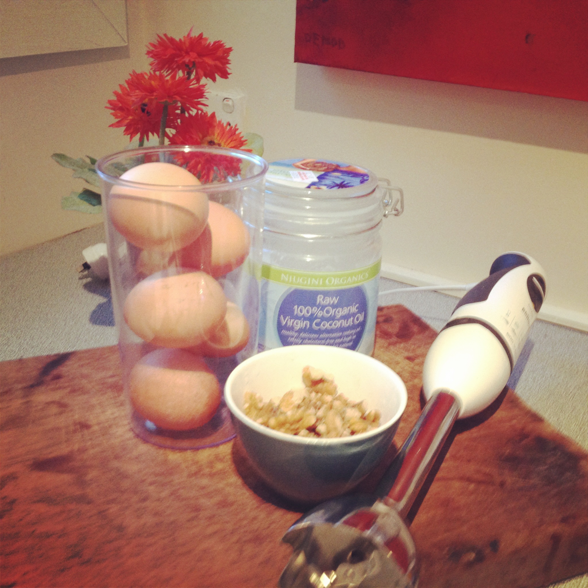 [I then used the same blender attachment, which connects to a stabmixer, to do the eggs…thus, two containers, one appliance in total. Am I the ONLY person who finds this kind of efficiency deeply satisfying?].