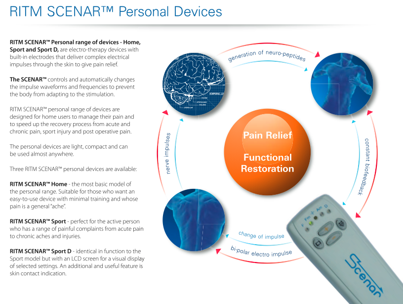 SCENAR is an acronym for ‘Self Controlled Energo-Neuro Adaptive Regulator’. It’s an electro- bio-controlled device initially developed for astronauts for managing pain and overall health while in space. It uses a harmless (unless you get a little bit addicted to the pain, as I do) electric impulse that stimulates the body’s own adaptive mechanisms, via a biofeedback process. The effect of SCENAR is based on electric impulses of a specific shape – patterned from natural nervous discharges in the human body. Former USSR nations have approved the SCENAR on the national health care system and the US FDA acknowledges the technology as a viable method of pain management. Here in Australia some health funds also recognise it.