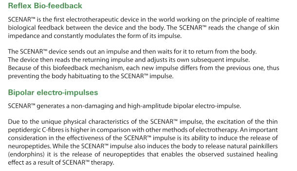 The SCENAR sends an impulse through the skin tissue, and measures the time reaction of tissue (SCENAR measures all tissues, not only skin) to that pulse and modifies the pulse in order to create a tendency toward what might best be called a ‘healing pattern’. In other words, the designers of the SCENAR have identified a particular response pattern that tends to be associated with a general ‘healing’ event in tissue. It ‘nudges’ the response of the tissue in that general direction. It uses a biofeedback loop to do it, constantly comparing the response with the desired pattern until they match.