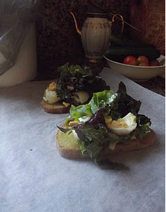 While the eggs boil, prepare your green leafy vegetables – parsely, coriander, lettuce and any other vegetable you would like. Mix with 4 tablespoons of extra-virgin olive oil, pinch of celtic sea salt and pepper.Place bread on plate. Spread grass-fed butter on the bread, as much as you like. Cut the eggs into 1/4’s and place on bread. Finally, add the green leafy vegetables, drizzle with olive oil, sprinkle salt and pepper, and you are ready to eat a beautiful and nourishing breakfast!