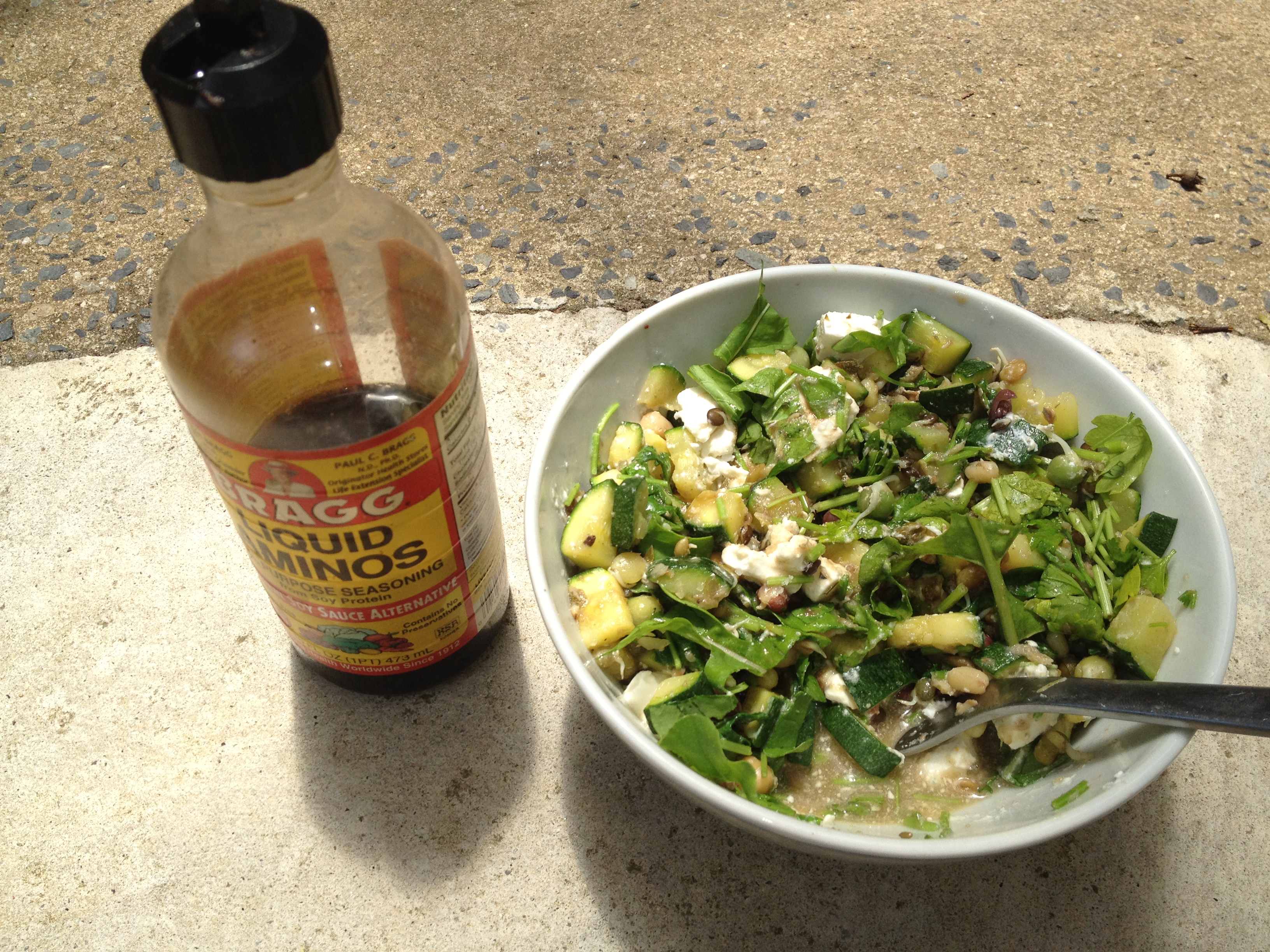 * Add to a mish-mash meal. Steam some veggies (broccoli or zucchini) and the sprouts or braise as above (with some Liquid Aminos) and then toss through 1/2 a chopped avocado, feta and rocket…perhaps some capers…