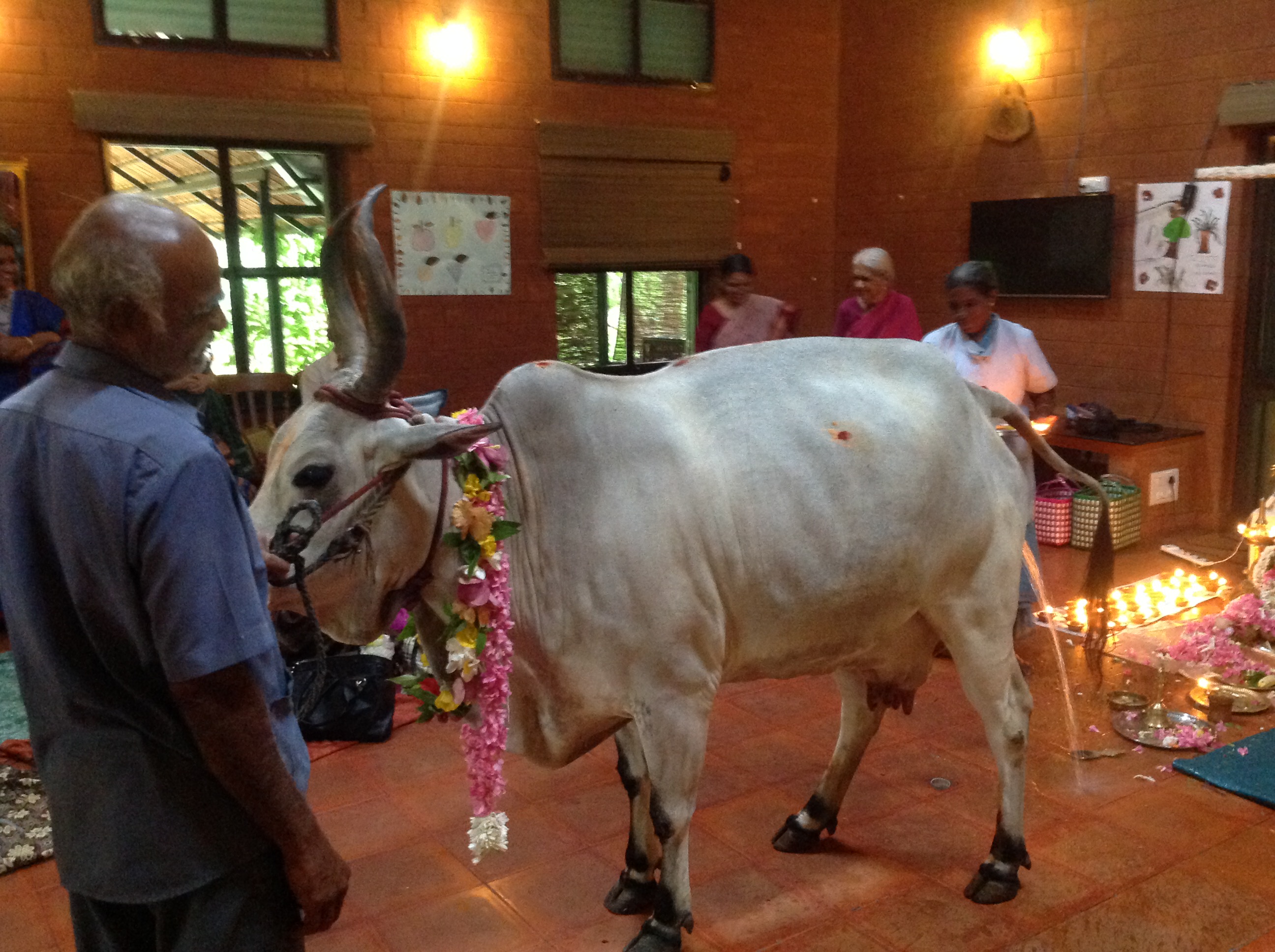 One day we did a nine-hour cow puja. This entailed eight hours of chanting and adding flowers to an elaborate shrine of candles and gaudiness from 8am until the climax when the big old cow, that’s been waiting outside chewing cud, is led inside to the mud-brick meditation room. It’s positioned, with a fair bit of fuss and opining from all involved, to face east with its back to the shrine, its docile face to us. You get the picture. If not, you will have from the photo above.