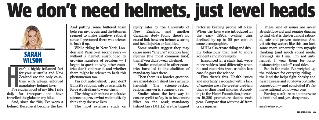 In fact, the laws have a negative impact on safety and wellbeing that goes way beyond arguments about “inconvenience”, “curbing of freedom” and bad hair. Folk who go at me on forums and yell at me from their cars, as well as jocular journos on morning shows who mock me (without thinking there might be some nuance and research in the equation), automatically assume I’m just lazy, entitled or vain in my stance. No! The most crucial factor is this: