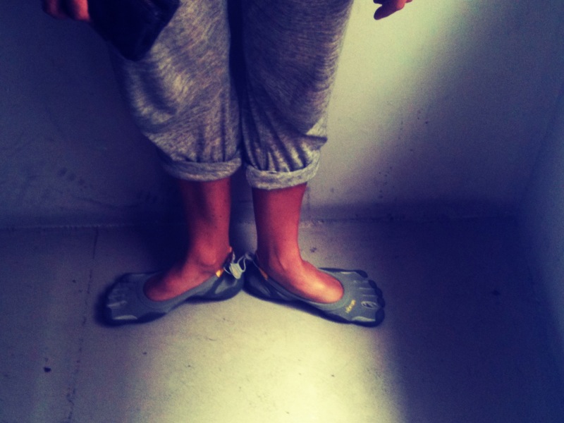 Sarah trialled some Vibrams earlier on this year, for a Sunday Life column on barefoot running. Of course, she doesn’t do anything half-heartedly; so after wearing them in the safety of our office for the morning, we went outside in search of lunch. Sarah with her frog shoes still on. “For research”. I laughed. And took photos (of course). Which I posted on twitter(of course). This from the column: