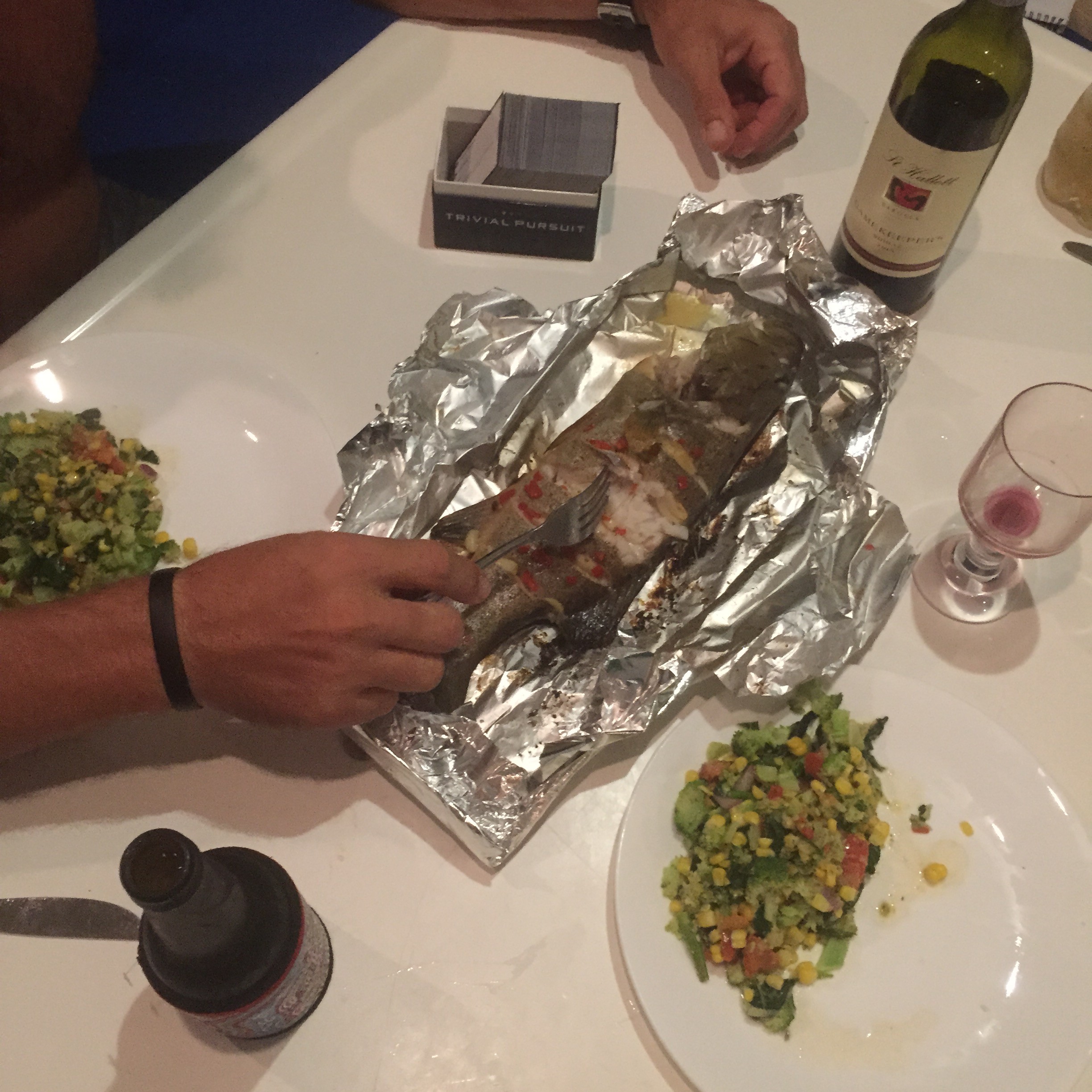 Then we’d sail off and explore and fish and practice putting sails up and down. There’s a kayak on board, too. And you’re supplied with flippers, snorkels and stinger suits.